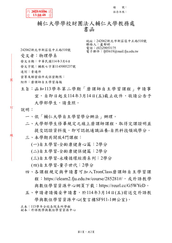 函知113學年第二學期「磨課師自主學習課程」申請事宜,自即日起至114年3月14日(五)截止收件,敬請公告予大學部學生,請查照。2025-03-10 /wp-content/uploads/2024/03/1234-1.png 0 0 013859 /wp-content/uploads/2024/03/1234-1.png 0138592025-03-10 10:11:502025-03-10 10:11:50函知113學年第二學期「磨課師自主學習課程」申請事宜,自即日起至114年3月14日(五)截止收件,敬請公告予大學部學生,請查照。