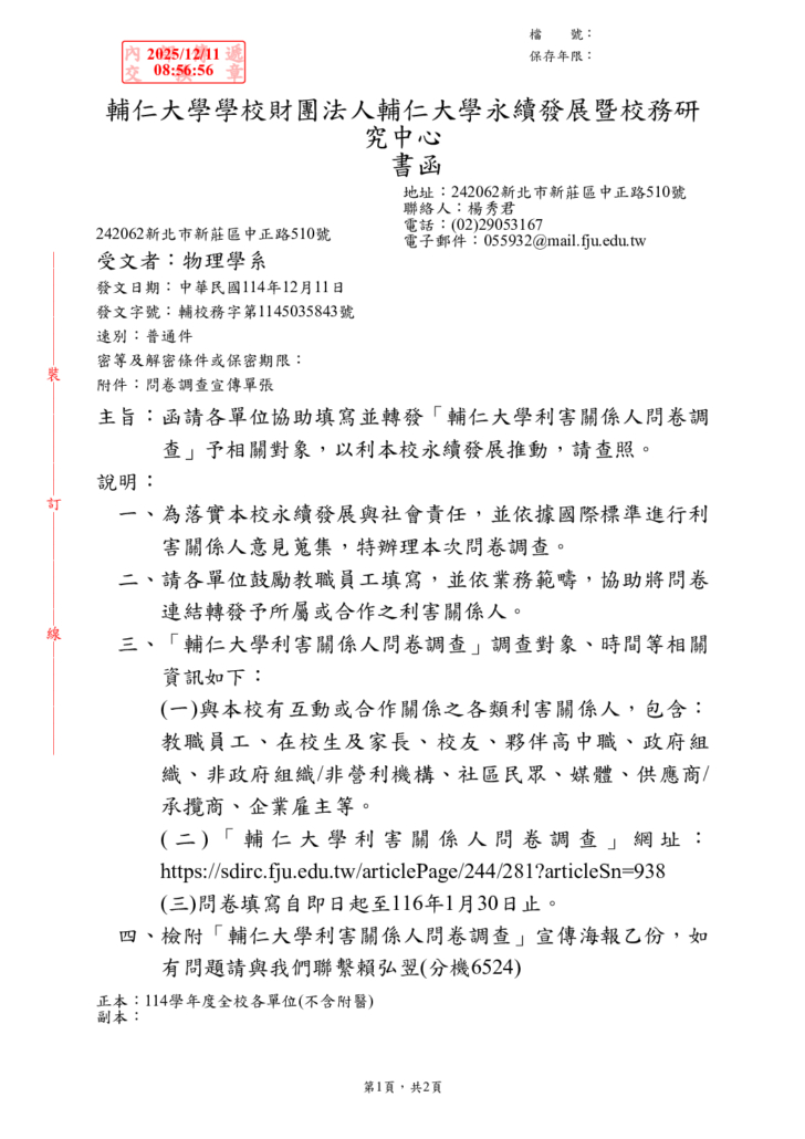 函請各單位協助填寫並轉發「輔仁大學利害關係人問卷調查」予相關對象,以利本校永續發展推動,請查照。
