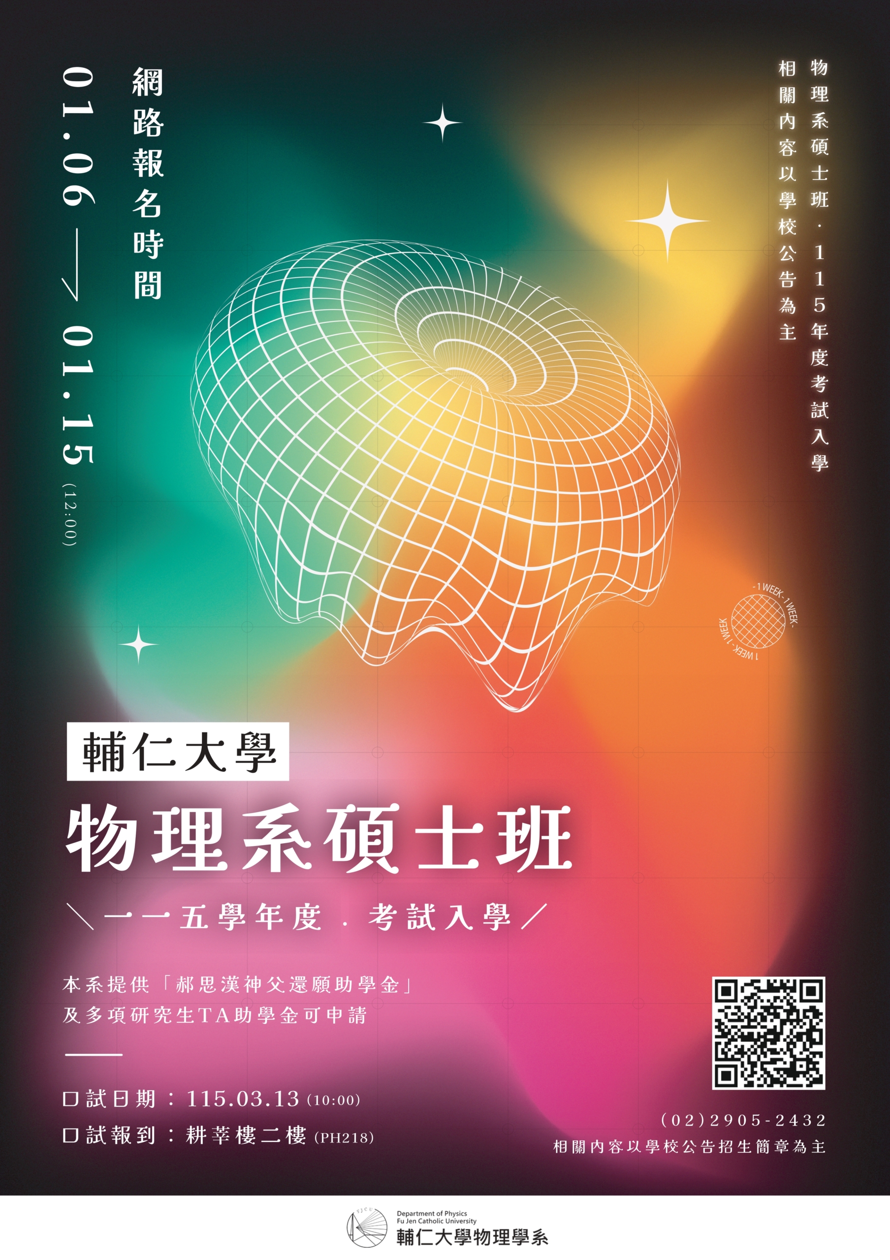 115學年度碩士班入學考試2025-12-17/在: 招生公告, 最新消息, 系所公告 https://www.phy.fju.edu.tw/wp-content/uploads/2024/10/公告1.png 2000 2000 014074 /wp-content/uploads/2024/03/1234-1.png 0140742025-12-17 09:54:312025-12-17 09:54:31115學年度碩士班入學考試